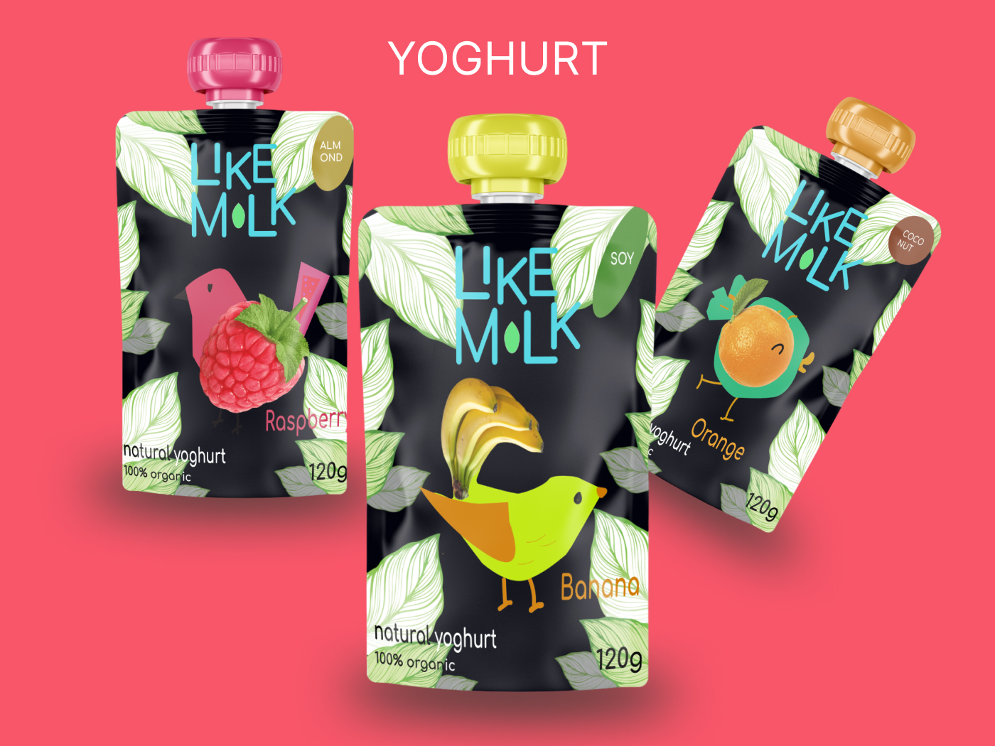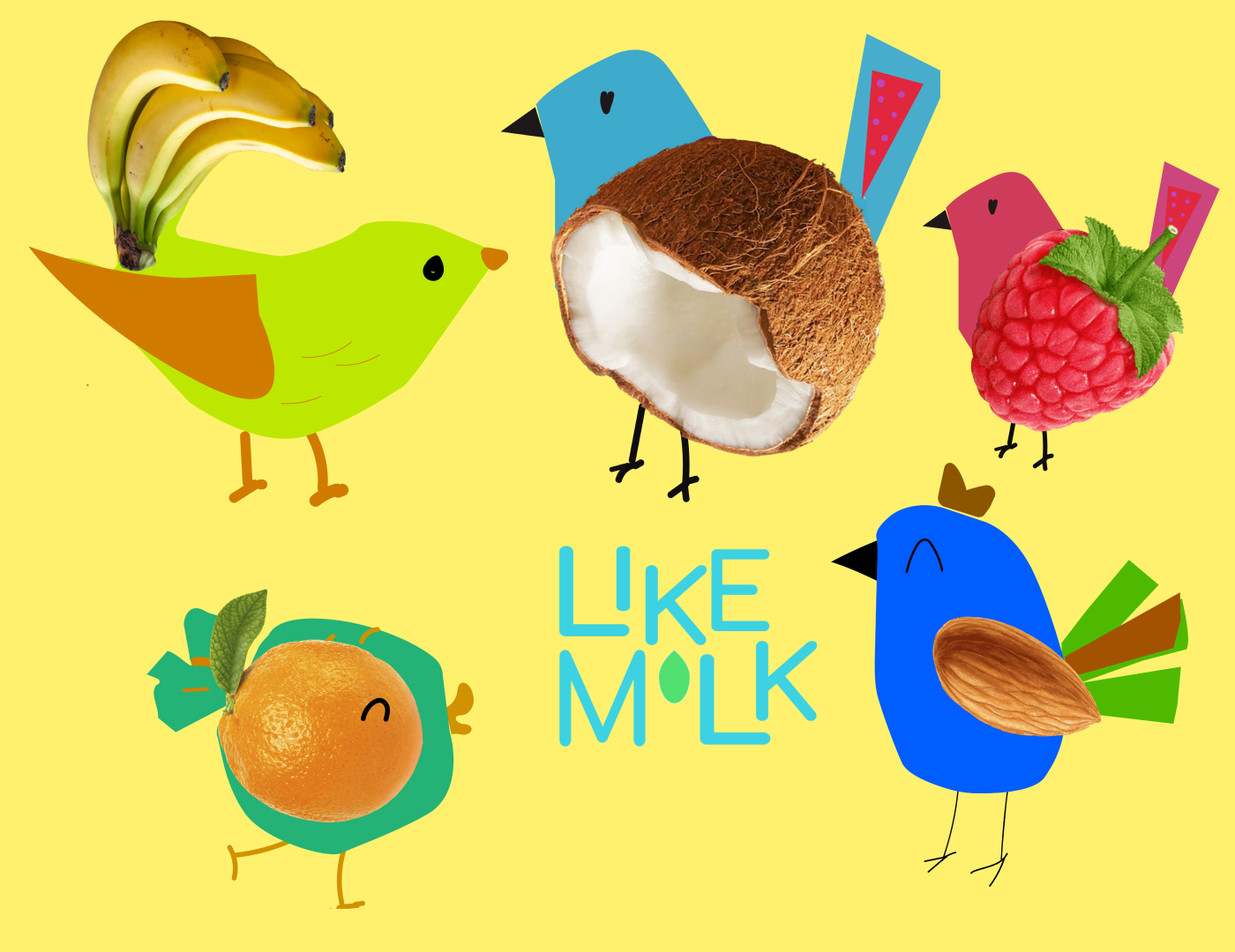 Яркий игривый дизайн упаковки для продуктов из растительного молока.